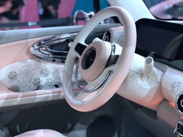 粉白皮質(zhì)雙輻式多功能方向盤,皮質(zhì)座椅之上印有玫瑰花紋,還有以鏤空以及“鉆石”包圍工藝設計的中央扶手箱,處處透著精致優(yōu)雅氣息。